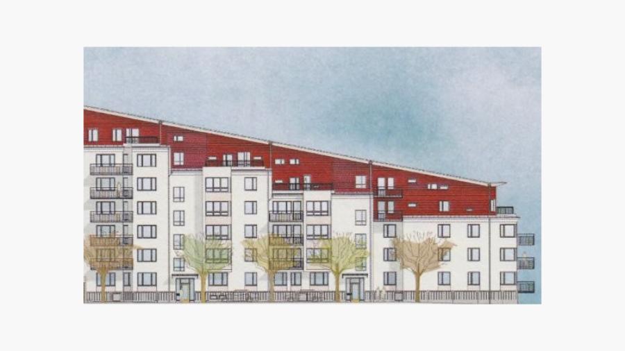 Huset har en hästskoform med en innergård i sydväst-läge som vetter mot skogsbeklädda Befästningskullen. Huset som uppfördes av JM under 2004-2005 har en karaktäristisk arkitektur med stora pulpettak på flyglarna där föreningen satt upp en solcellsanläggning. Byggnaden har 4-7 våningsplan med total 96 bostadsrättslägenheter med en sammanlagd boyta på 8 579 kvm.
